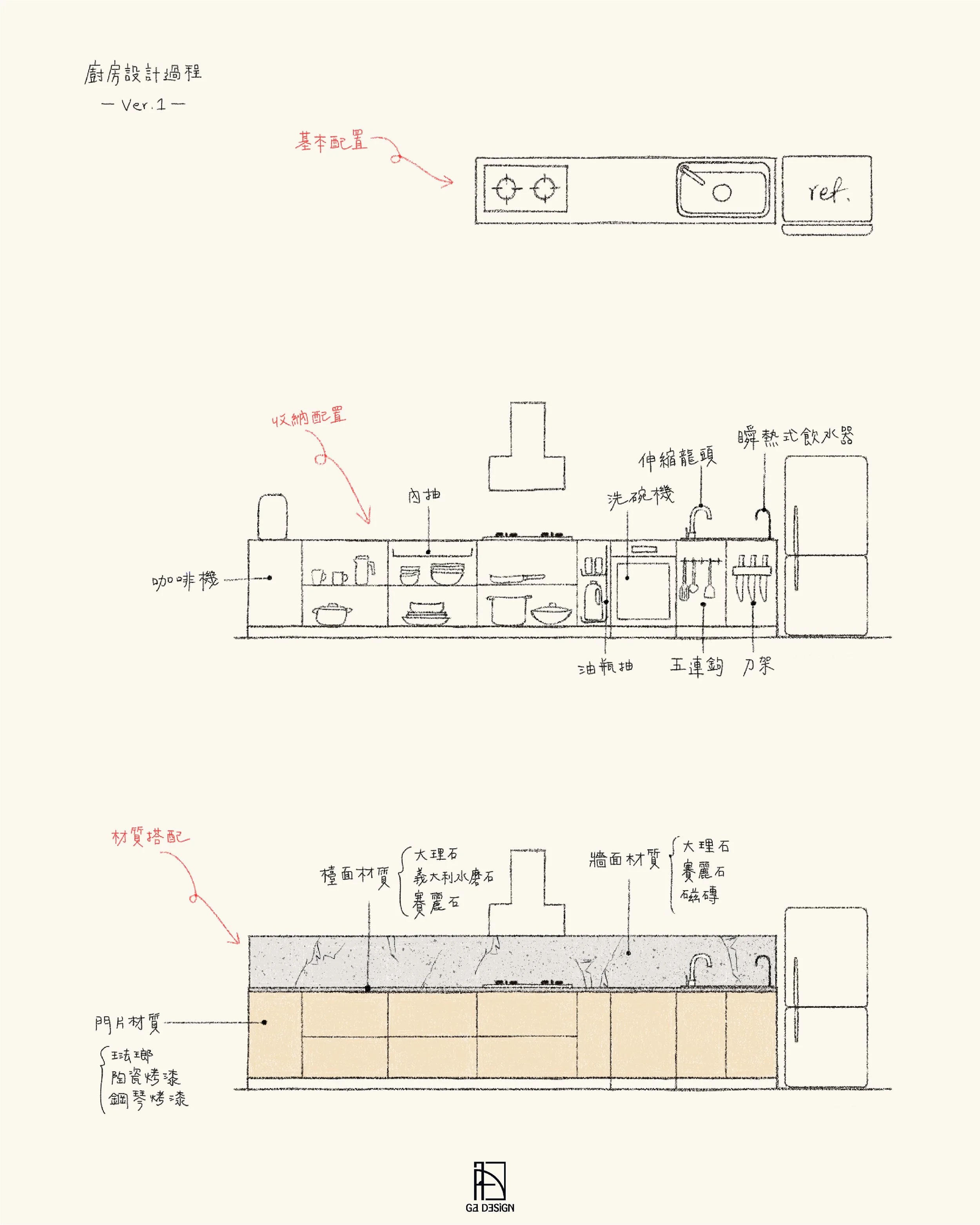 接續會依據使用者習慣及物品量體,考量料理瓶罐、鍋具、碗盤、刀具、烹飪用具及相關電器等等的對應收納及使用擺放位置。並配置抽油煙機及濾水器等必須設備的相對位置及高度。